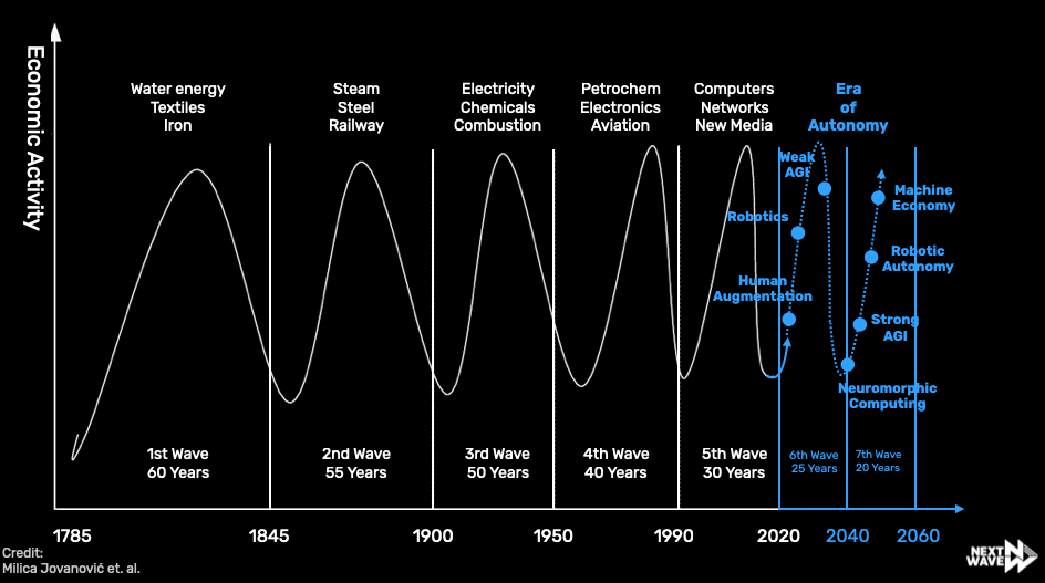 The Sixth Wave, now nascent, will see emerging artificial intelligence, advanced robotics, self-driving vehicles, and computer augmentation profoundly enhance human capabilities. Its breakthroughs will enable the Seventh Wave - a machine economy allowing autonomous devices to build, maintain and operate other autonomous machines requiring minimal human input. Neuromorphic computing architectures modeled on biological brains along with scalable clean energy sources will support proliferating these innovations.