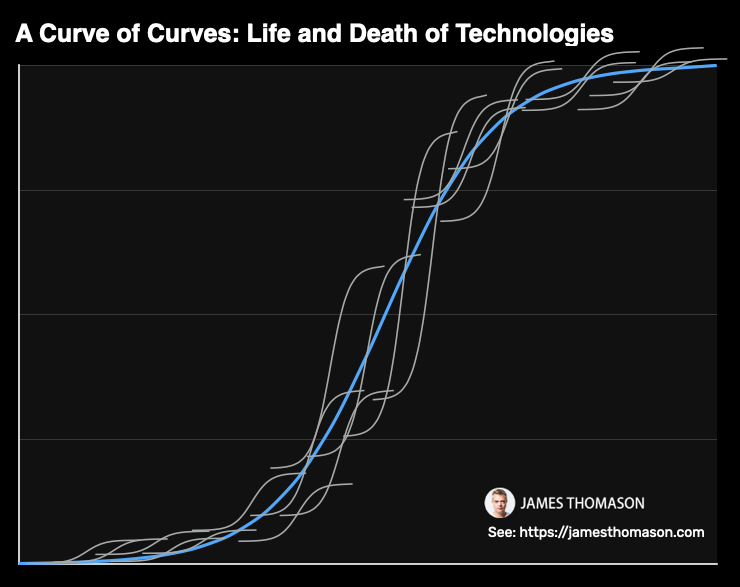 The common S-shaped curve used to depict multi-decade innovation waves is actually composed of many smaller S-curves. As business cycle expert Joseph Schumpeter described, each individual technology goes through phases of birth, accelerated development, and eventual obsolescence. While an overarching innovation wave can be said to follow an S-curve lasting 50-60 years, this longer curve consists of a succession of shorter S-curves for each constituent technology and business model.