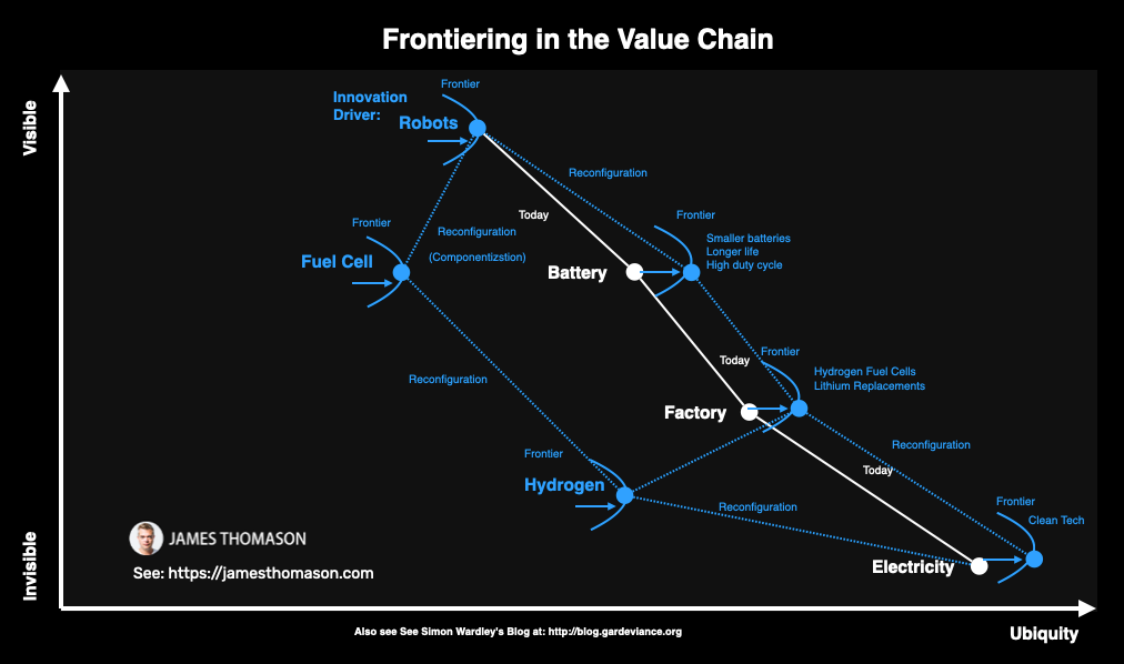 For instance, new APIs, developer tools, cloud architectures, device capabilities, polymers, etc may need pioneering to enable the upper-level innovation. So each underlying layer races to advance in parallel. This constant imperative to "frontier" drives continual reconfiguration as new developments commoditize old assumptions. Yesterday's frontier API or material must now adapt to changing paradigms. In this sense, the frontier actually resides across each vertical, with innovations propagating up and down the chain in a contagion of change as entire value networks must transform to sustain breakthroughs occurring at any one layer.