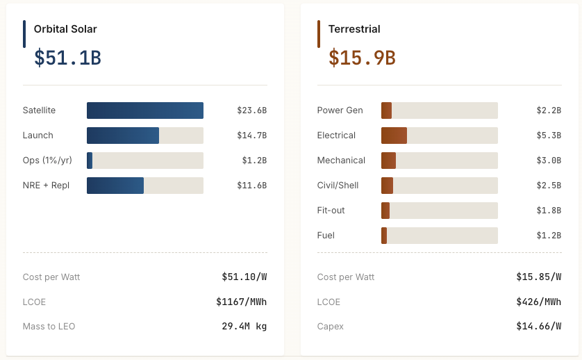 So I wrote all that and then I found Andrew McCalip already said it first, did it better. Light years better. His Economics of Orbital vs Terrestrial Data Centers calculator is a marvelous, interactive rathole. Read it. Then buy SpaceX stock. Go ahead, I dare you.