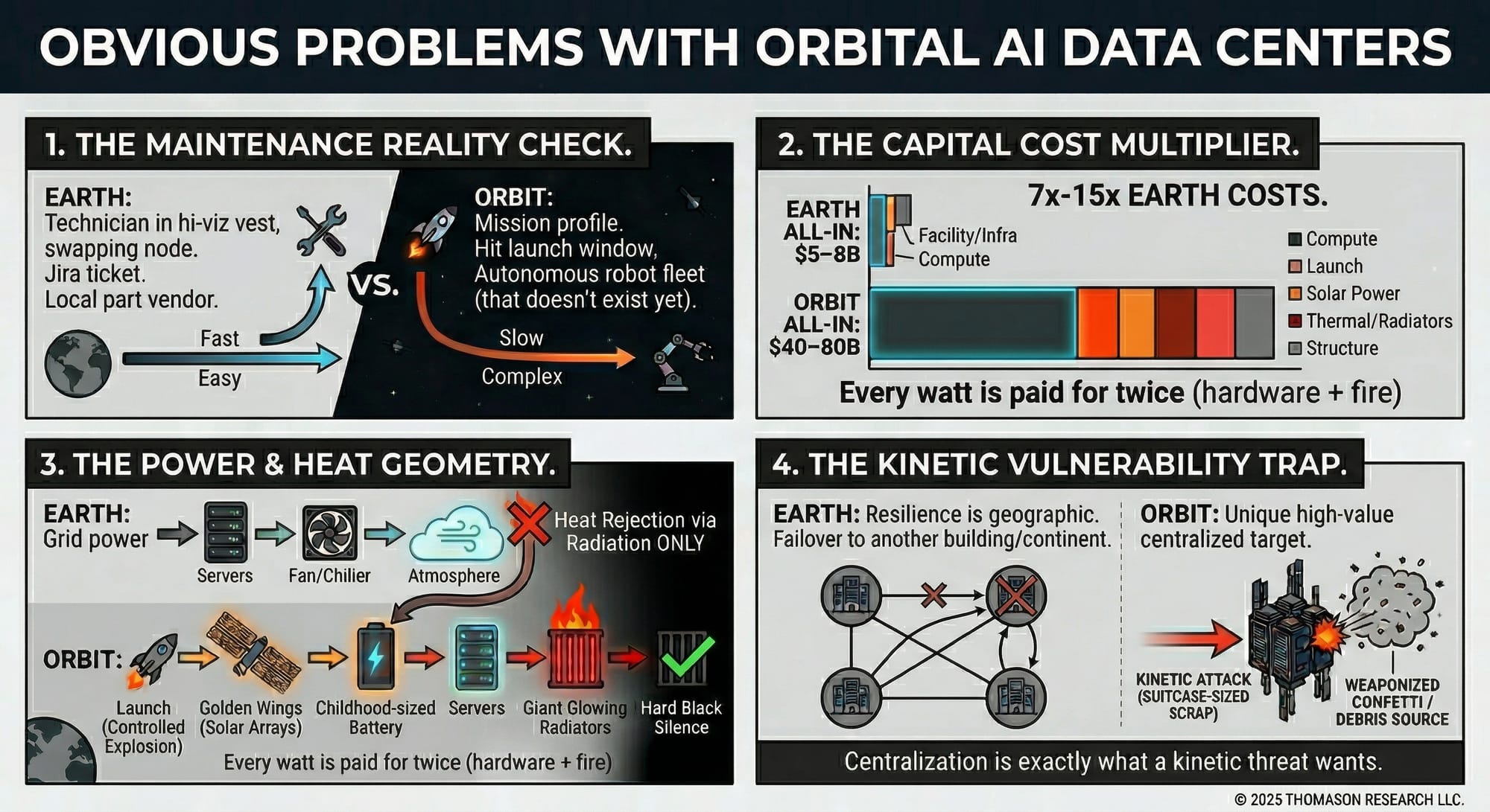 To make the numbers look even remotely sane, you centralize with one big power plant, one big cluster, one big structure to amortize your launches and solar and radiators. But centralization is exactly what a kinetic threat wants. You’ve concentrated value so efficiently that impact is now a strategy.