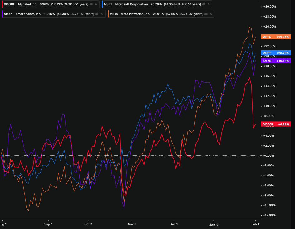 Sundar Pichai has delivered on growth and earnings at the helm of Alphabet's sprawling, complex technical empire, but the stock languishes. In the 12 months from the date of this post, GOOGL was up just over 40%, almost exactly the same as the Nasdaq 100. The relative performance of the Four Horsemen of AI, META, AMZN, MSFT, and GOOGL tells the story.