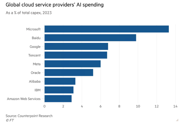 Lastly, when we look at capex spending on AI by cloud providers in 2023, Google is at the head of the pack, but was forecast to be outspent by Microsoft. That will almost certainly change in 2024. In its most recent earnings call this week, Google executive Ruth Porat stated: